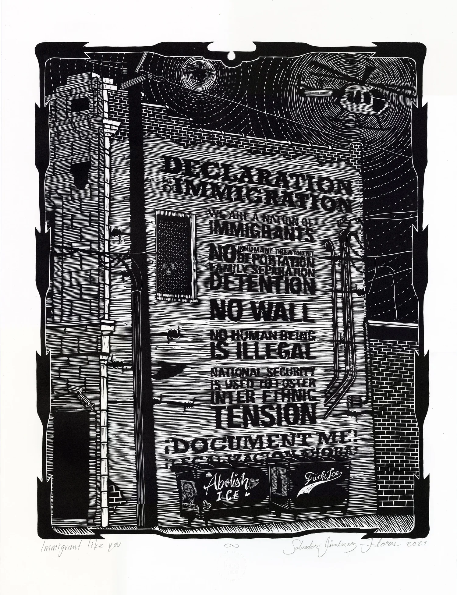 + Inmigrante como tú, homenaje al mural de la declaración de inmigración / Immigrant Like You, Homage to the Declaration of Immigration Mural. One Color Linoleum Print, 30” x 22” 2021. ∞ Edition. Printed by students from Milwaukee Institute of Art and Design.