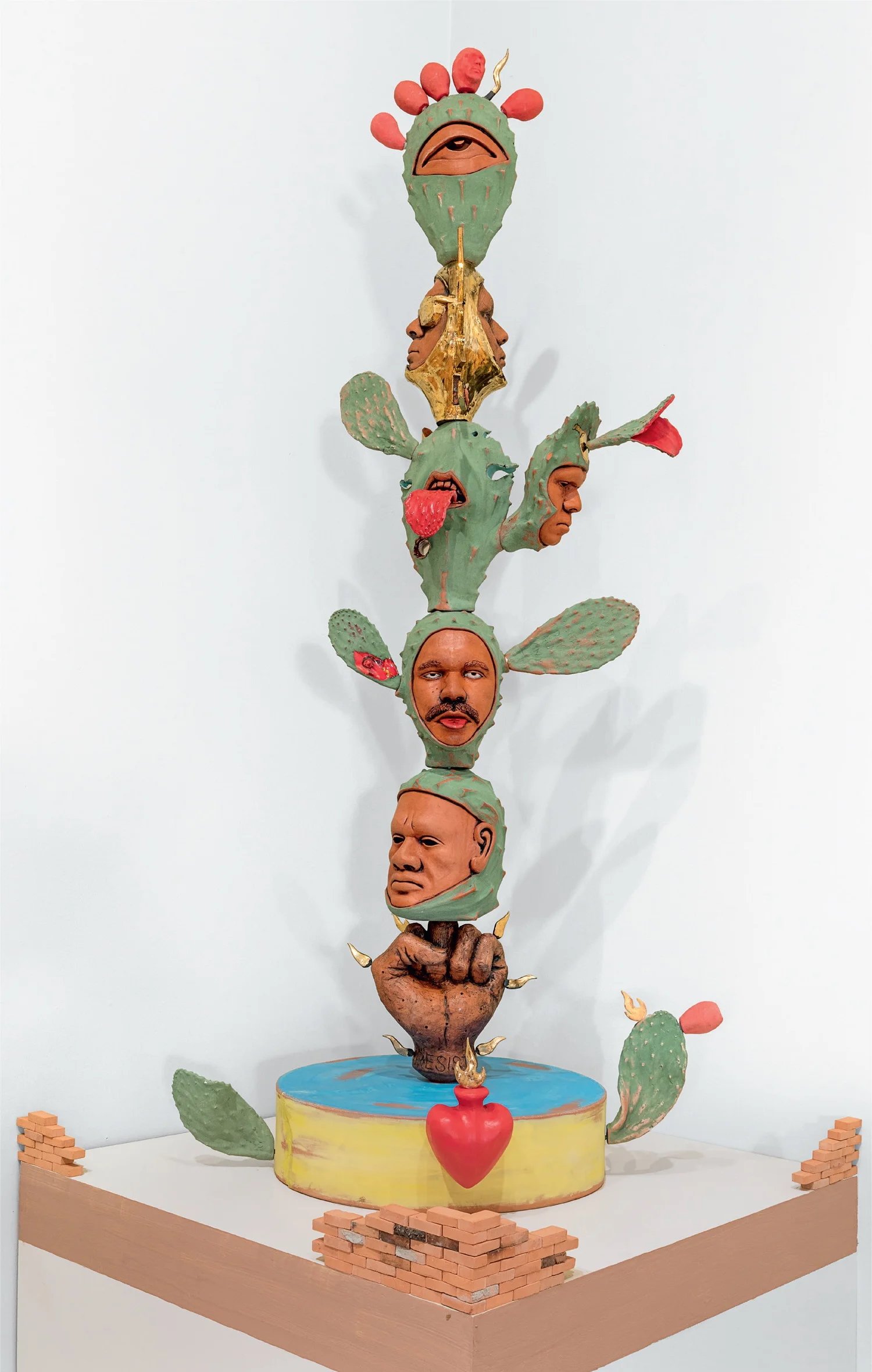 + La resistencia de los nopales híbridos / The Resistance of Hybrid Cacti. Terra-cotta, porcelain, underglazes, gold luster and terra-cotta slip, 96 in x 96 in x 96 in, 2016.